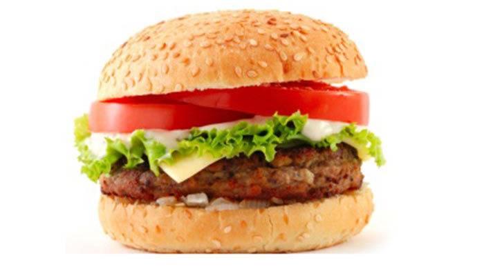 Булочка, котлета из говядины,сыр, лист салата, помидор, соус