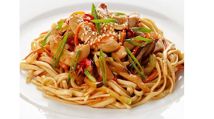 Куриное филе, перец болгарский, морковь, перчик халапеньо, терияки