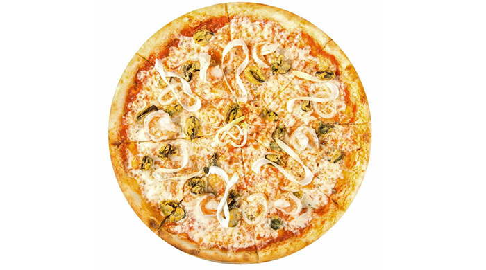 Креветки, кальмар, помидор, сыр, сметанный соус