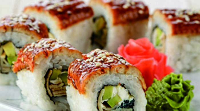 Угорь копчёный, креветка тигровая, сливочный сыр, огурец