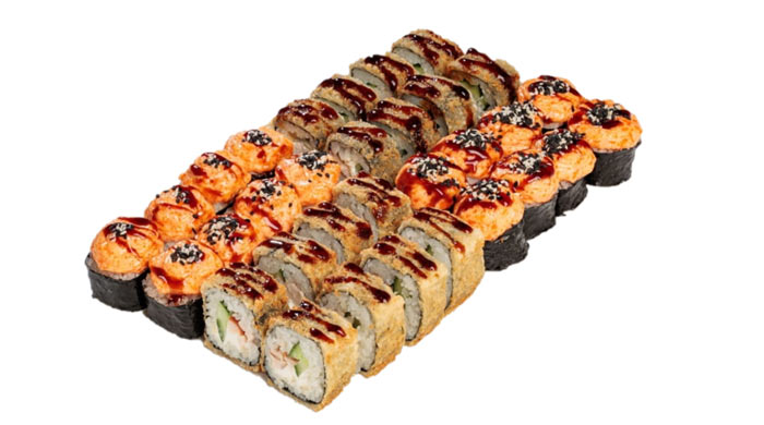 Запечённый ролл с тунцом, запечённый ролл с креветкой, запечённый ролл с угрём, маки хот